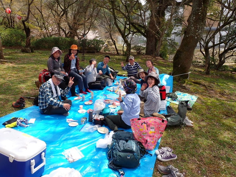 JR日田彦線は、小倉と日田を結ぶ鉄道であったが平成29年の九州北豪雨で被災し完全復旧を断念した。現在は、田川郡の添田駅まで鉄道で行ける。いわば終点駅である。その駅から近い岩石山(がんじゃくさん)そして桜の名称でもある添田公園と公共交通機関で山に登れて下山後は花見が楽しめると言う私にとってはとても好都合の山である。花は、少々早いと思っていたが、添田公園に着くと7分咲き、天気も良さそうなのできっと午後にはもっと咲くだろうと期待して山を歩く。そして添田公園に降ると名誉会員のお二人が出迎えてくれた。花見だけの参加でわざわざ来てくれた。おかげで花見は盛大だった。時折、ひらひらと舞い散る桜の花びらに春を感じる日であった。手伝ってくれたメンバー、笑いをくれたメンバー、本当にありがとう。(清水)