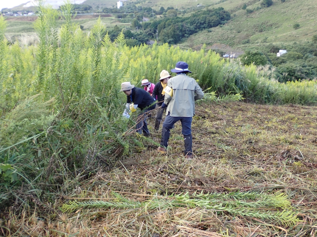 今年で5回目です。参加者はこれまでで一番少なかった。みな夏バテ? セイタカアワダチソウは例年よりも成長が早いのか、それとも栄養たっぷりなのか巨大化していた。心配していた暑さは、風のおかげで和らぎ、木陰に入るととても快適だった。終わった後はリニューアルされた観察センターの会議室で反省会。と言っても参加者が少なかったことが私の反省である。(清水)