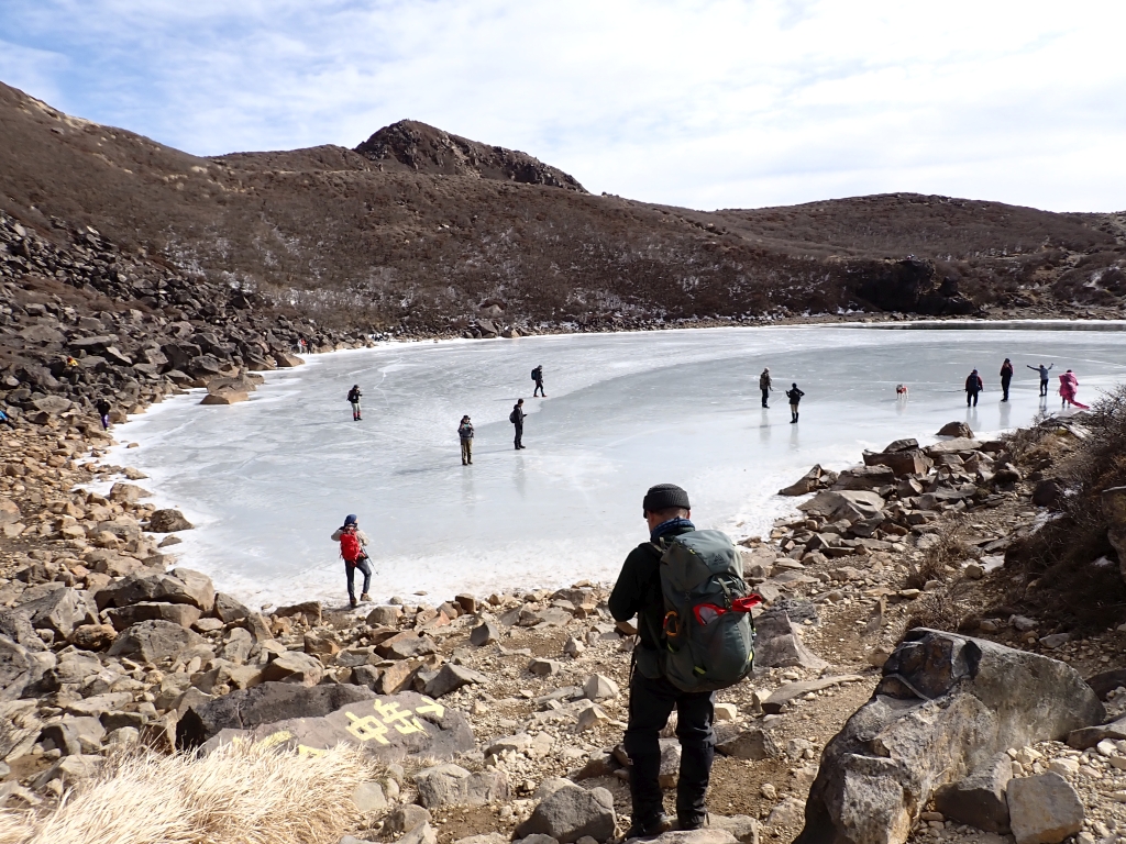 今年初の山は、臨時山行で氷結した御池を体験しようと言うことでメンバーのがしんさんが計画してくれた。雪化粧した九重連山を期待したが4月上旬の陽気が続き、雪はすっかり溶けてしまい牧ノ戸峠に到着した私たちは青空が広がる景色だけを期待して登り始めた。展望台に着くと期待以上の眺め、空気が澄み切っているのか、由布岳も麓まできれいに姿を見ることが出来た。もちろん第2展望台では阿蘇山も。久住分かれから御池を目指すが、雪はない。そしていよいよ御池、何と氷の上にたくさんの人が賑やかに遊んでいるではないか、「やったあ!」と思わず。今日の目的は達成できた。せっかくなので中岳に登頂し下山。気温が上がり、登山道の凍っていた土は泥濘んで靴は靴でない姿になってしまったが、それでもそれが、メンバーとなら楽しめるので不思議だ。(清水)